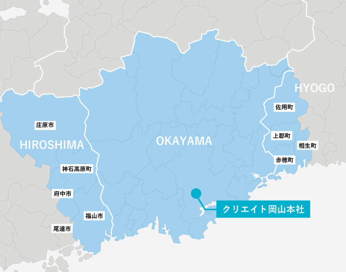 岡山市、倉敷市、津山市、玉野市、笠岡市、井原市、総社市、高梁市、新見市、備前市、瀬戸内市、赤磐市、真庭市、美作市、浅口市、和気町、早島町、里庄町、矢掛町、鏡野町、勝央町、奈義町、久米南町、美咲町、吉備中央町、新庄村、西粟倉村